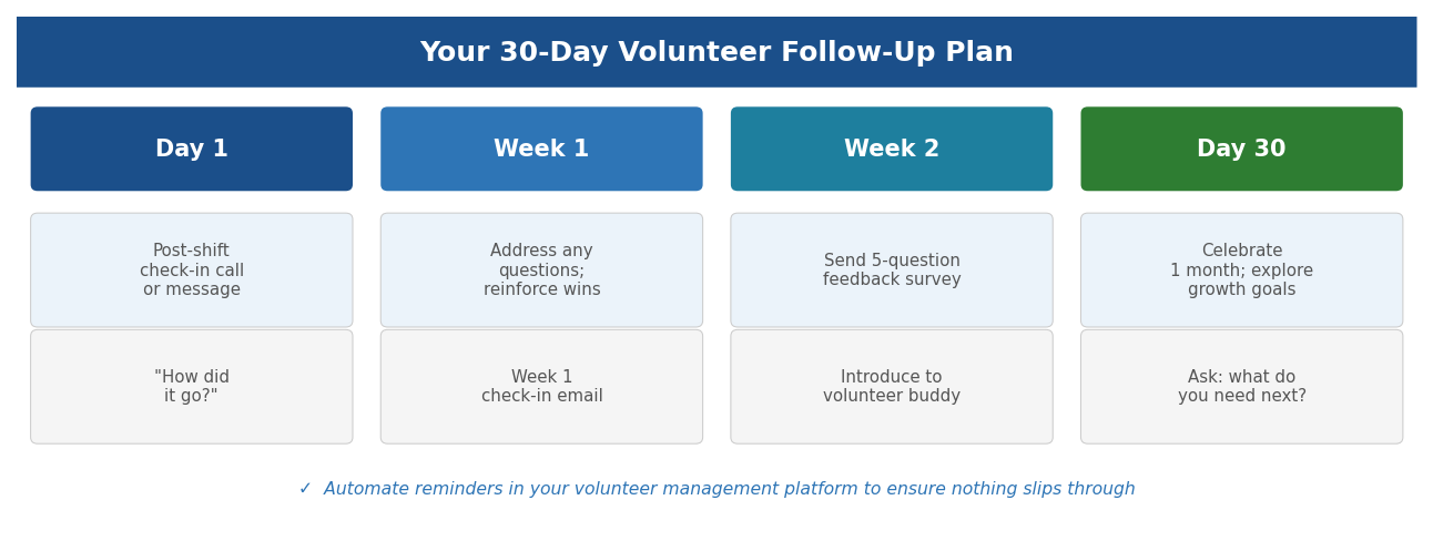 The choice to stay or step away is shaped in the weeks that follow in the consistent, small moments of connection, recognition, and follow-through that signal to a volunteer that they truly belong in your program. The first 30 days are especially important.