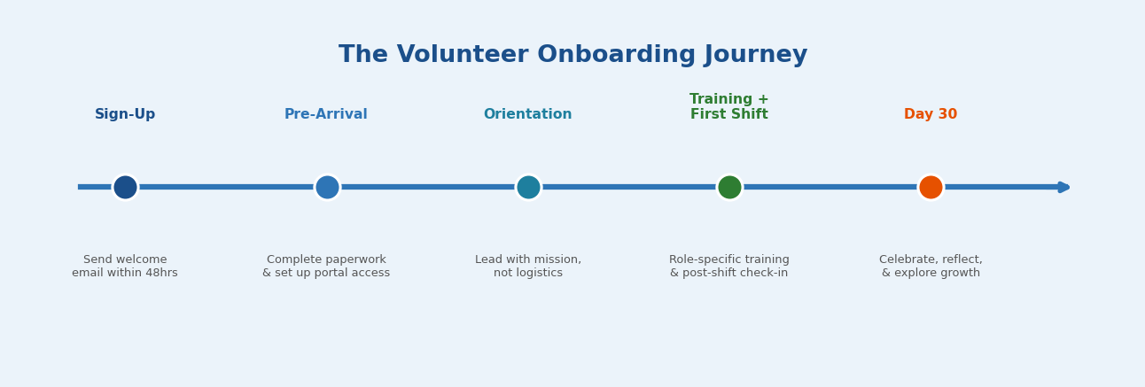 In the next section, you will see a visual overview of the full onboarding journey. Then we will break down each stage so you can design a process that is both personal for volunteers and scalable for your team.